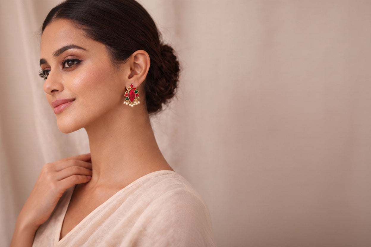 Charming red gemstone stud earrings featuring elegant pearl accents and traditional gold-toned detailing. These versatile earrings offer a perfect balance of simplicity and sophistication, ideal for both everyday wear and special occasions.